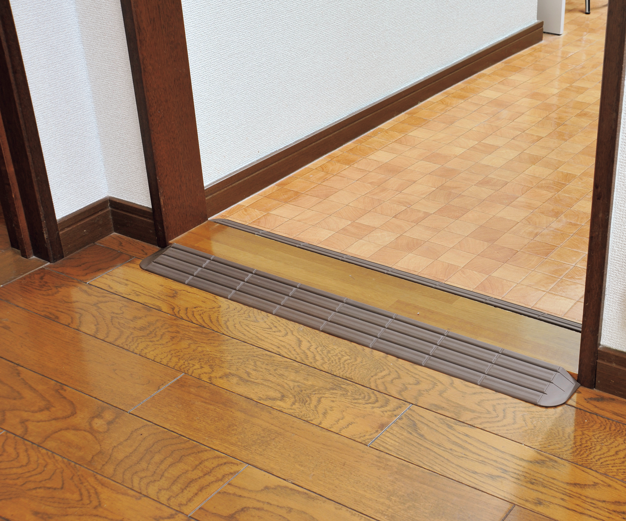 先端部分および両端は段差が小さく、滑らかな形状のため、すり足でもつまずきにくく、車いすや歩行器でも楽に走行できます。